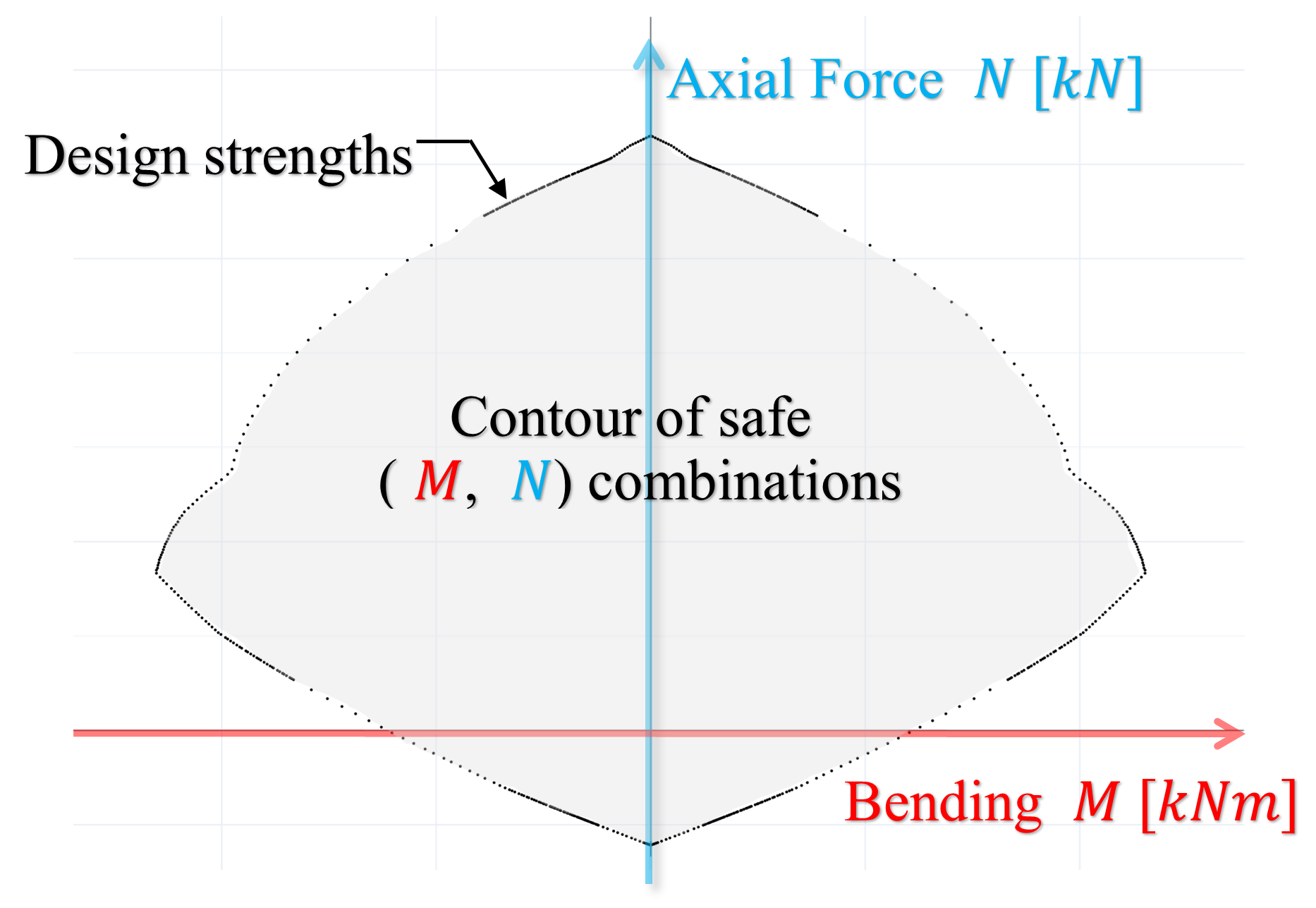 As a consequence, Biaxial Bending – Axial Force Interaction Diagrams have been extensively used as a practical tool in the industry. In these diagrams, the axes represent the mentioned forces, and a contour of safe M, N combinations is depicted.
